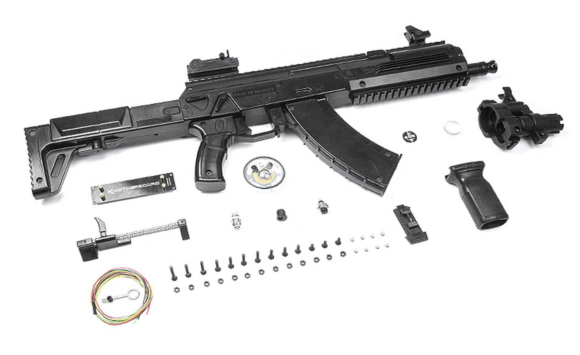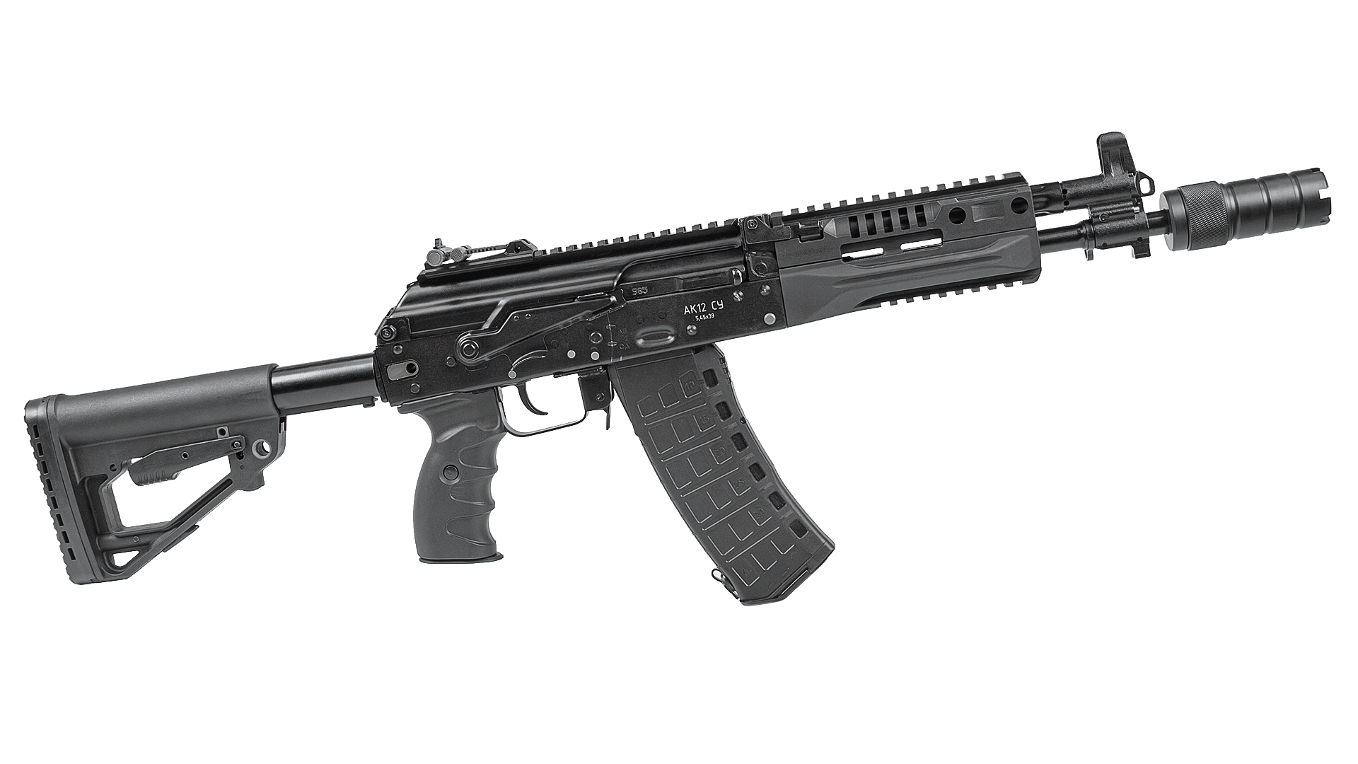 A shortened version of the popular combat prototype. The barrel ends just behind the gas tube, thus reducing the overall length of the gun by 7 cm. There are no particular design differences from the full-size model, still the same reliability and power of combat steel. Numerous Picatinny rails allow for the fitting of all types of attachments and sights.